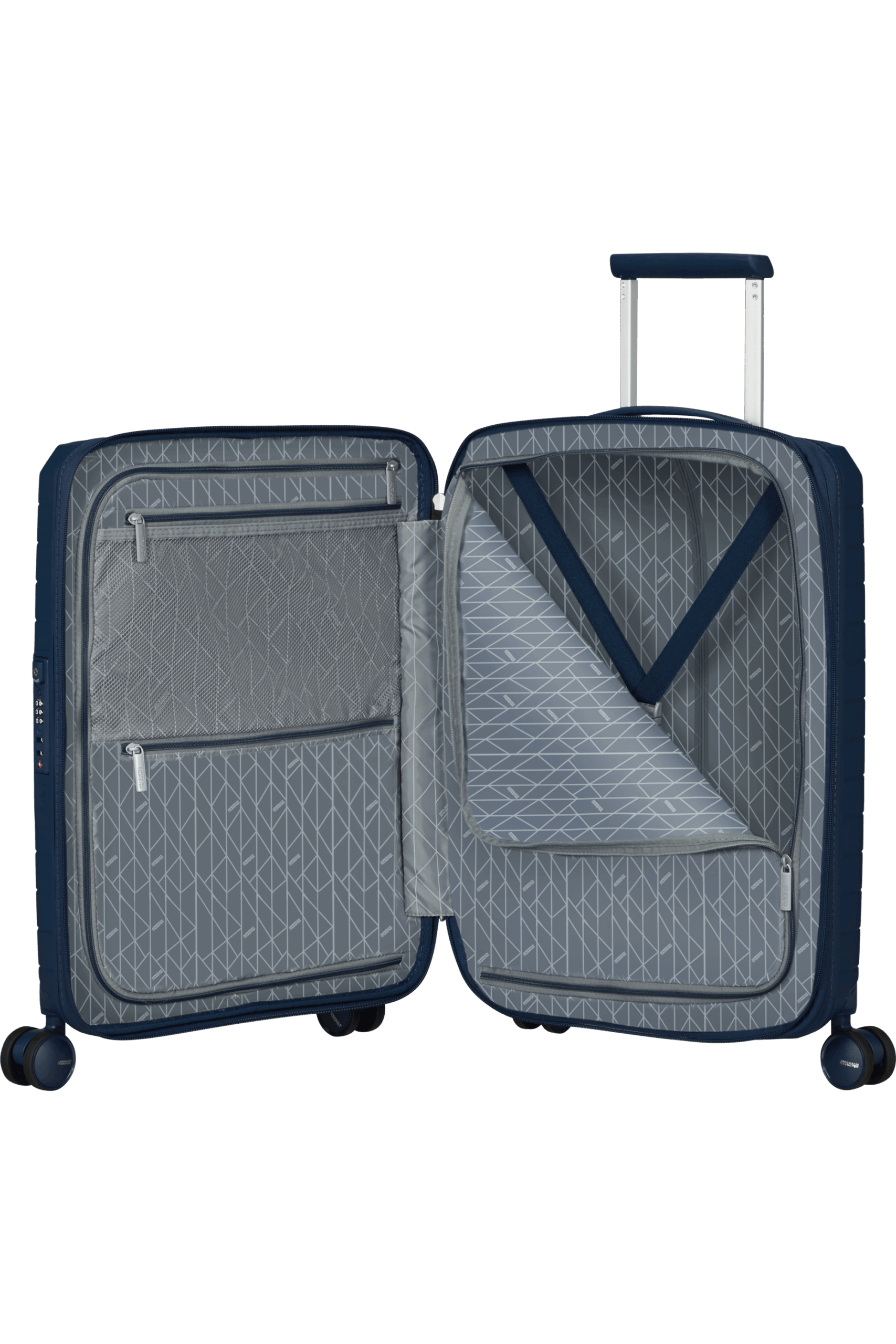 Διαθέτει 4 διπλές περιστρεφόμενες ρόδες, ενισχυμένη τηλεσκοπική λαβή, TSA κλειδαριά 3 ψηφίων και ευρύχωρο εσωτερικό με ιμάντες συγκράτησης και διαχωριστικό.