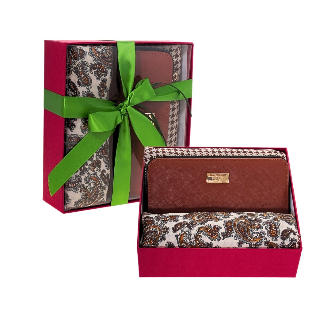 Μία πολυτελής συσκευασία δώρου, σε κόκκινο χρώμα, που περιλαμβάνει ένα γυναικείο πορτοφόλι 19V69 ITALIA που κλείνει με φερμουάρ, διαστάσεων 20 x 10 x 3εκ.